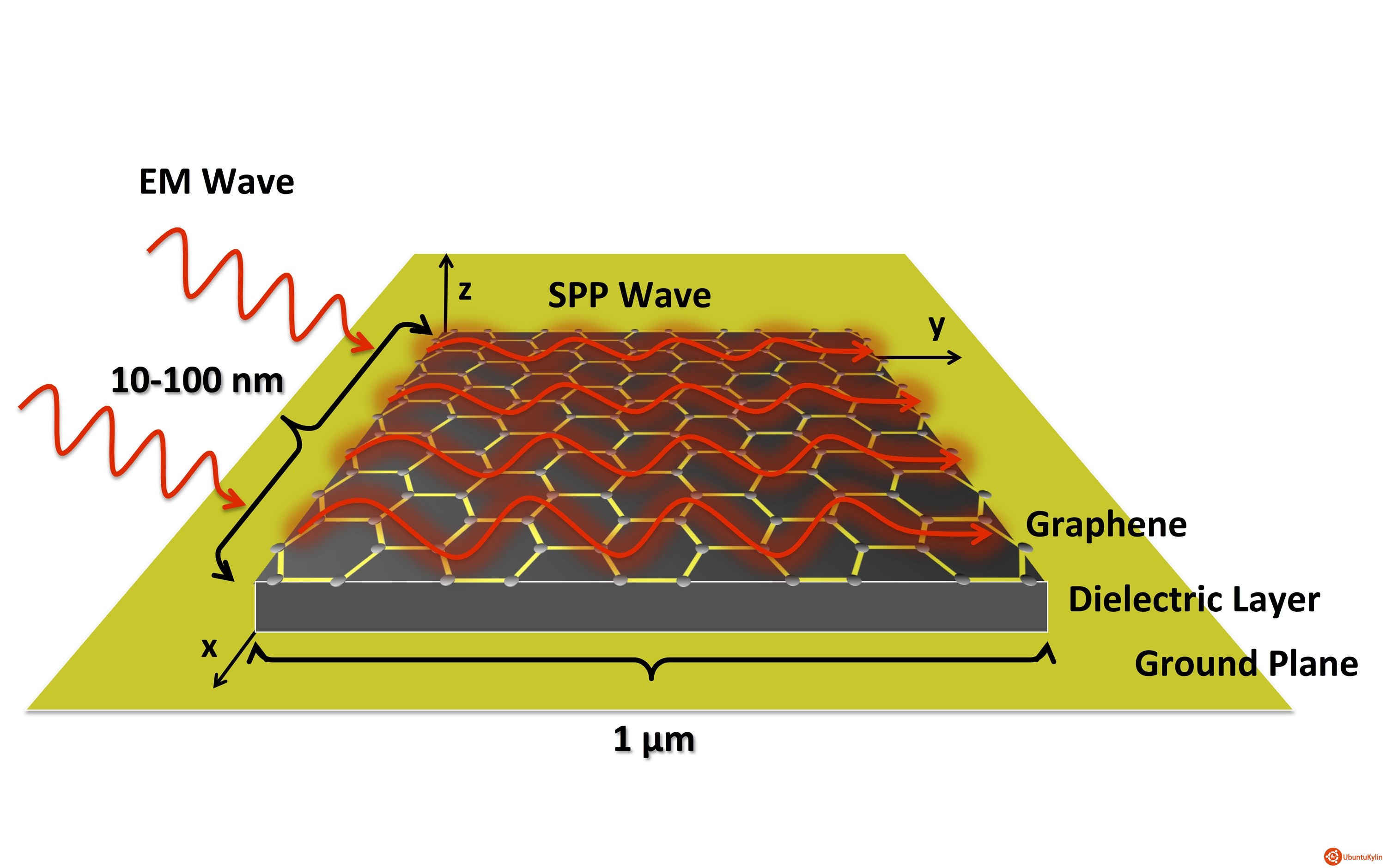 当石墨烯中的电子被传输来的电磁波激发时,会发生 Akyildiz 教授提到的“奇特的传播”。这种情况下,电子开始来回运动,创造电荷振荡,结果在石墨烯的表面上产生了密闭的电磁波。这种现象就是人们熟知的表面等离子体激元(SPP)波,这使基于石墨烯的纳米天线在太赫兹频率范围内运作成为可能,这个范围在 0.1 到 10 太赫兹之间。而像金这样的金属也能产生 SPP,但是它们只能在更高的频率中才能做到。
