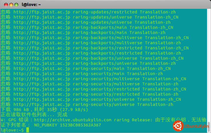 W: GPG 错误:http://archive.ubuntukylin.com raring Release: 由于没有公钥,无法验证下列签名: NO_PUBKEY 1523BC085362A367
