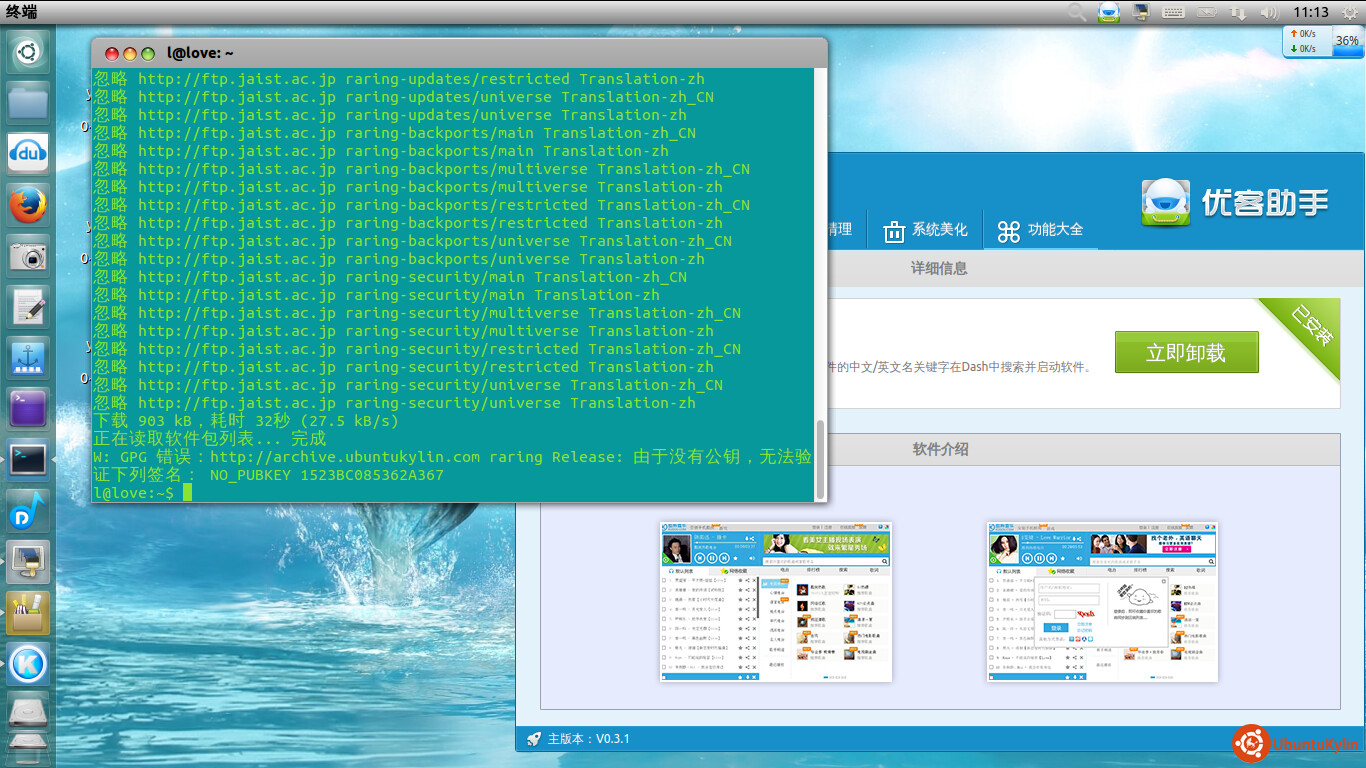 全图为证看看这是怎么回事,,我没乱说,,顺便问一下领导们,你们的ubuntukylin源没有公匙,为什么你们的优客助手竟然私自下载软件呢???请问这样做系统还是安全的吗???这和强行安装有区别吗???还有你们的软件包我忘记名字了,主题包,和ubuntu有冲突你们对用户有提示吗???