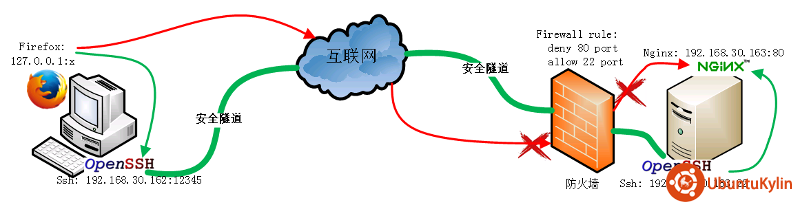 从图中可以看到,由于防火墙的设置,客户端浏览器Firefox想要直接访问Web服务器Nginx是不行的;但经过ssh工具可在客户端和服务器之间建立一条Ssh隧道,而Firefox直接访问本地的12345端口即可间接的访问到Nginx,这是否很神奇?