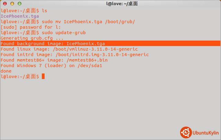 #刷新grub,只要你的终端输出IcePhoenix.tga他的名字,证明已经检测并启用了,如图