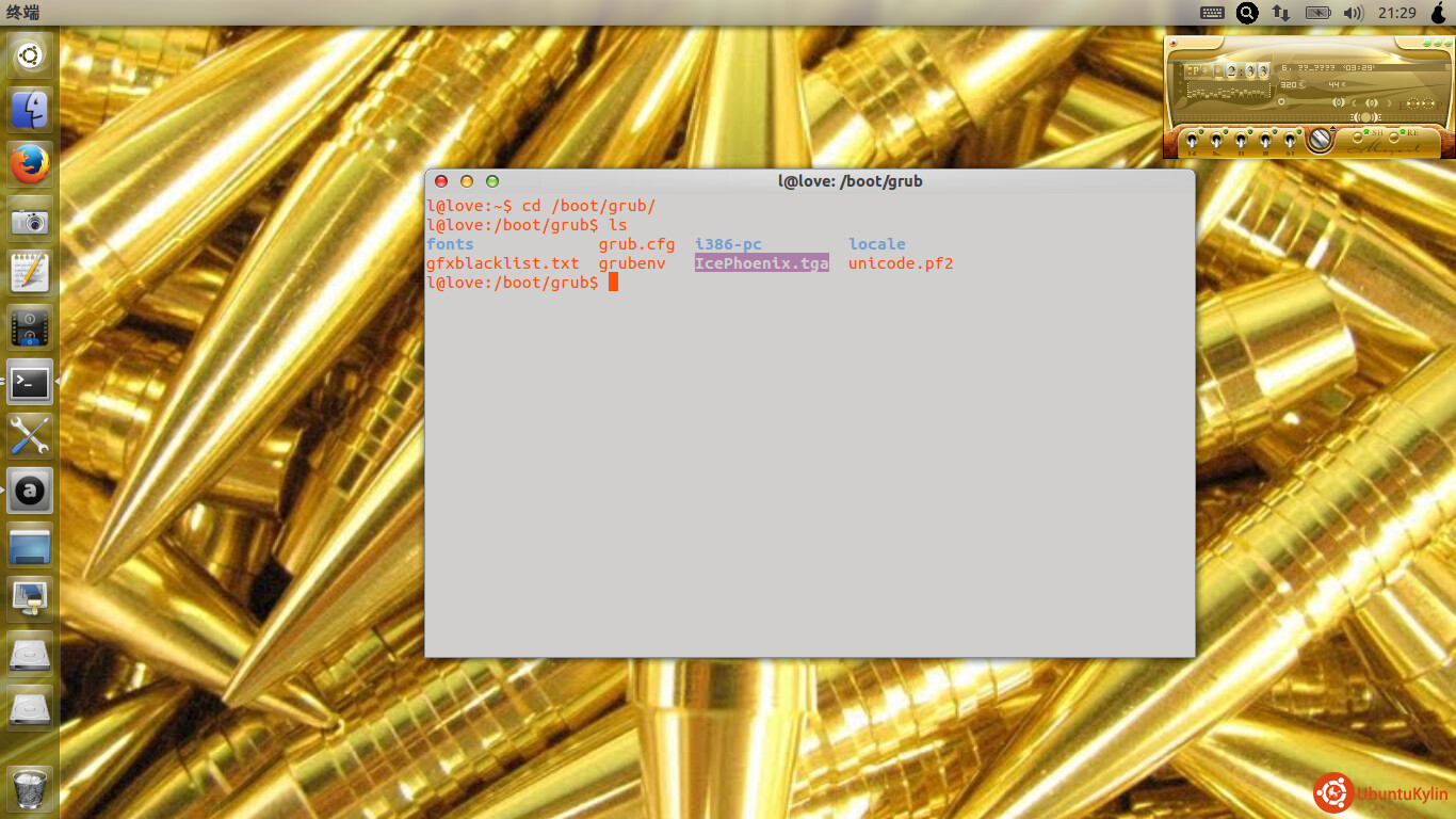 #ubuntukylin更换grub背景办法,与ubuntu为什么不一样呢,因为ubuntu遵循的原始设计第一选项,字符串说的很清楚,如果检测没发现图片,便执行黑白色,然而ubuntukylin已经更改了选项加入了设计者精心为使用的用户设计了图片,你直接像ubuntu那样直接mv里面肯定不显示,好了看下我的操作你一下便明白了,