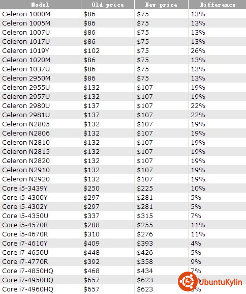 绝对价格下调幅度最大的是配备了GT3显卡的酷睿i7性能较高的“HQ”系列处理器和用于台式一体机的酷睿i5-4570R、i5-4670R和酷睿i7-4770R处理器。这些四核处理器的价格现在减少了33到34美元。对应具体型号,降价幅度为约5%到11%。此外,英特尔公司还将几款超低功耗的双核微处理器价格下调了4%到10%。