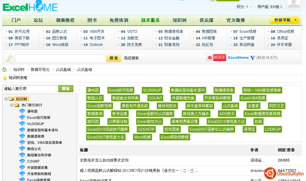 论坛到2014年3月份也有一年了,其中好帖不少,但对新手来说,想快速找到她们并不是易事;今天在ExcelHome论坛中看到了《知识树》,原以为是论坛自出的教程,进去发现是实用的好帖,让新手能快速找到吸取经验并迅速成长的通道,是个好创意,新手是更愿来这样的论坛耗时间,另付ExcelHome/tree链接: http://club.excelhome.net/tree