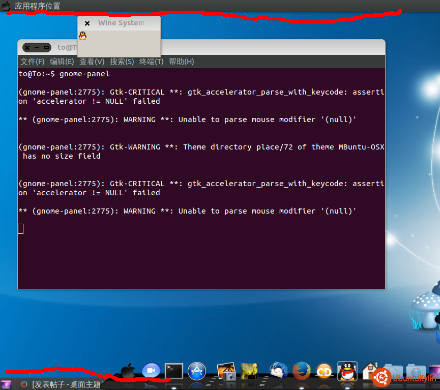 前几天看到论坛的人更换的ubuntukylin 13.10 mac 主题,我也尝试了下。有几步是没有按照文档做的,我看的是一些log 开机动画之类的就没有修改。 问题出在mac主题安装成功了,但是最上方的面板(gnome-panel)不见了。去网在找了很多资料,说是要安装sudo apt-get install gnome-panel,就装了一个。 是出现面板了,但是最上面 最下面都有 附一个图: