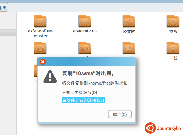 今天刚装好64位的ubuntukylin 14.04版,然后从局域网的共享盘中复制文件的时候提示“由软件导致的连接断开”,上百度和谷歌都找不到解决方法。这究竟是什么问题,已经尝试了很多次了,都是这个问题。