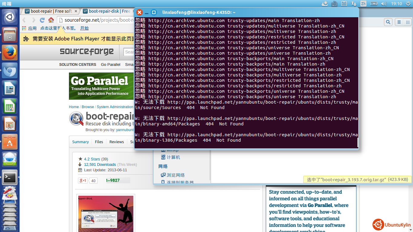 2、安装boot repair时,发现软件源有问题,不能下载,凡是有关launchpad.net的软件仓库信息或源都提示404错误,导致软件无法安装。