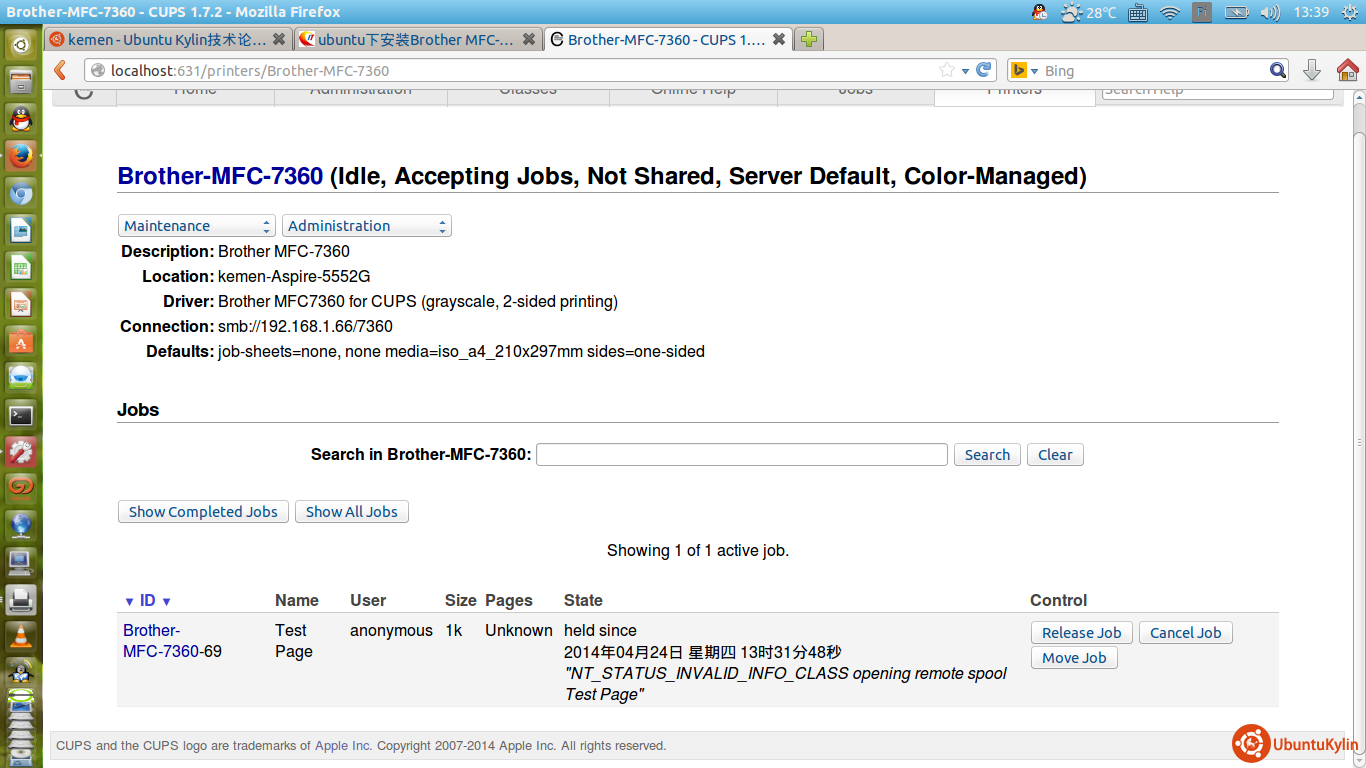 请教: 1:由于打印机为MFC7360一体机,有扫描传真复印等功能,所以只能装XP来共享 2:在笔记本装了XP或WIN7时,打印共享正常 3:笔记本装了UBUNTU KYLIN 64位后,可以正常安装XP共享的打印机,但打印不了,显示如下错误: 打印机状态:空闲 - NT_STATUS_INVALID_INFO_CLASS opening remote spool Test Page