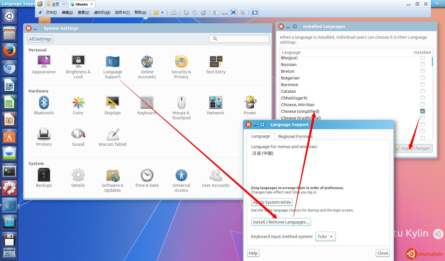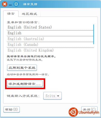按照楼上Jack的截图进入“系统设置”,选择“语言支持”,在语言支持对话框中选择“添加和删除语言”,如下图: