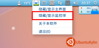 第二,优客助手并不是默认开机启动的,启动优客助手时会出现,可以通过点击右上角的优客助手图标,在菜单中选择“隐藏/显示监控球”即可,如下图:
