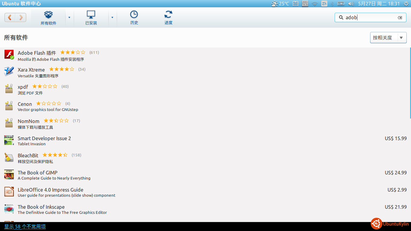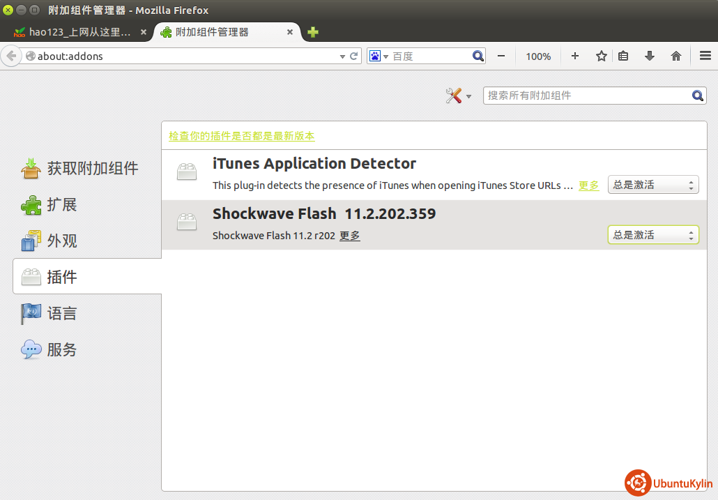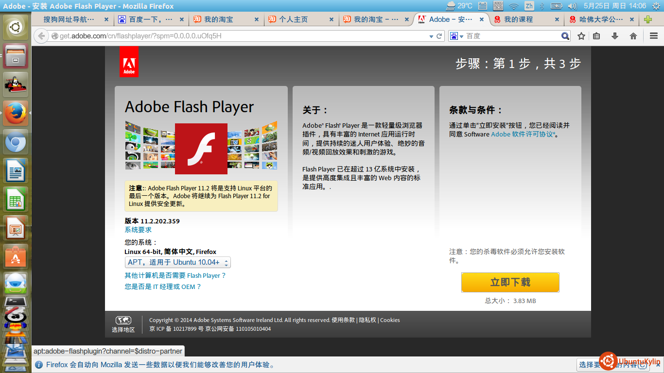 软件中心安装可以啊,我看了你的截图是火狐firefox浏览器,第二个图那个adobe flash插件是适用的吧!