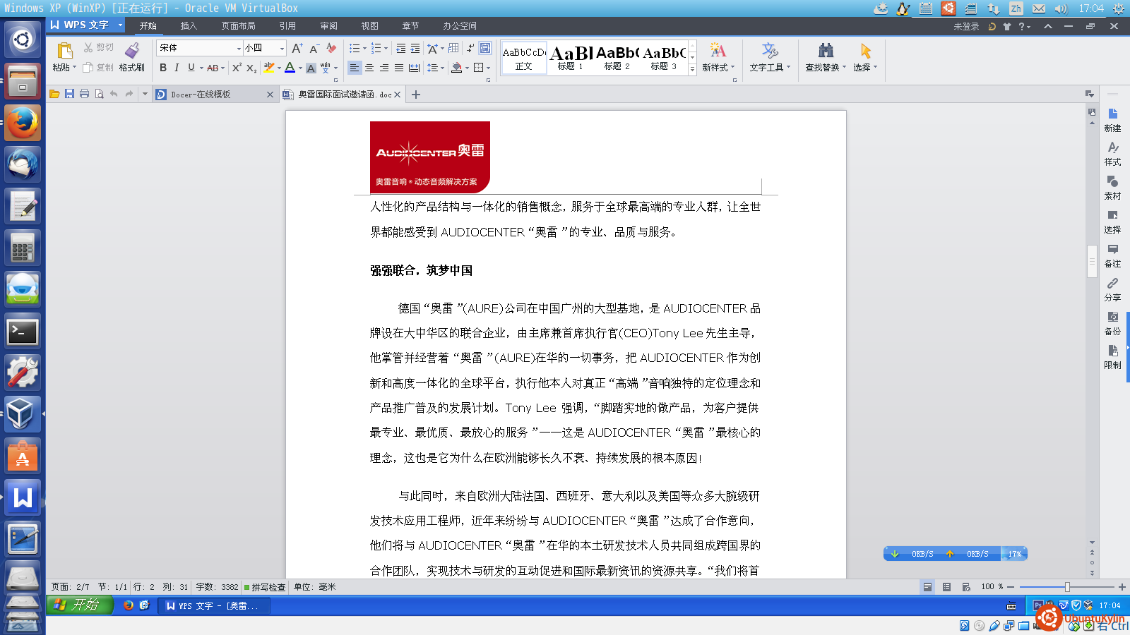 虚拟机windows下的WPS页眉图片显示正常: