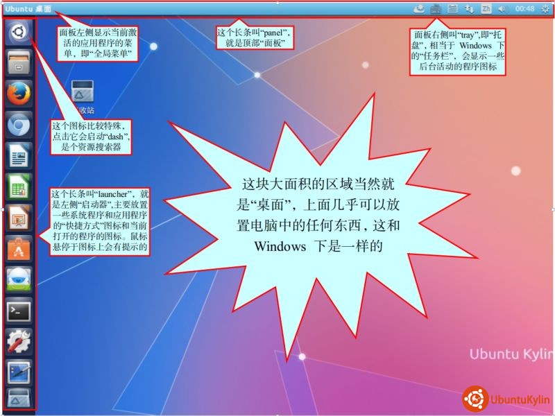 系统安装好了以后,尽管可以立即开始使用,但系统默认的配置及自带的软件往往不能满足我们的需求,所以,在正式使用 UK14 之前,我们还要对系统进行一下初始配置。为便于说明,先来简单认识一下 UK14 的桌面环境,按下面这张图中所示,熟悉一下几个名词(图1):