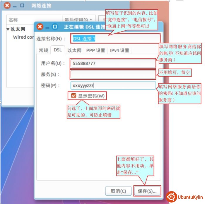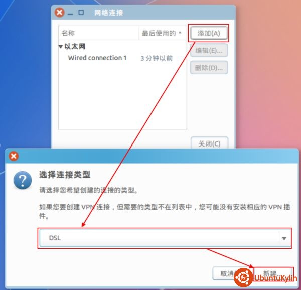 上图(图5)中,“DSL 连接 1”是默认的名字,可以随意更改(要改为汉字,可按“Ctrl + 空格”调出汉字输入法,默认 UK14 已安装了小企鹅汉字输入法,且默认是全拼输入法)。按图中所示填写好相关内容,保存后返回到“网络连接”窗口,见下图(图6):
