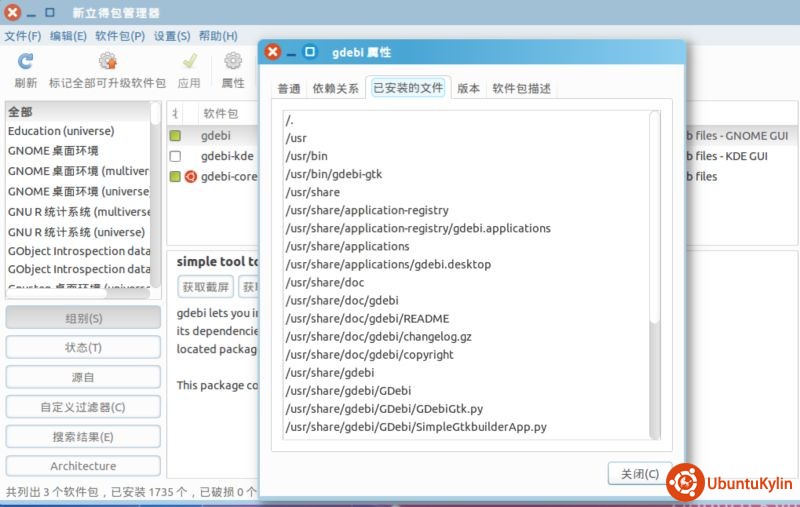若想知道 GDebi 在你的系统中哪些地方安装了哪些文件,可以在刚才的主界面列表中右击“gdebi”,在右键菜单中点“属性”,在弹出窗口中切换到“已安装的文件”,会看到下面的界面(图9):