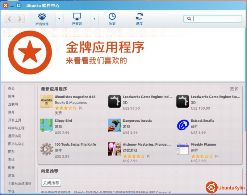 以上操作也可在 dash 中搜索“ubuntu kylin 软件中心”并用它来安装“新立得软件包管理器”。“ubuntu kylin 软件中心”看名字就知道是 ubuntu kylin 自己定制的跟“ubuntu 软件中心”一样的工具,不过目前该工具才刚刚起步,还没有足够的理由让我选用它。