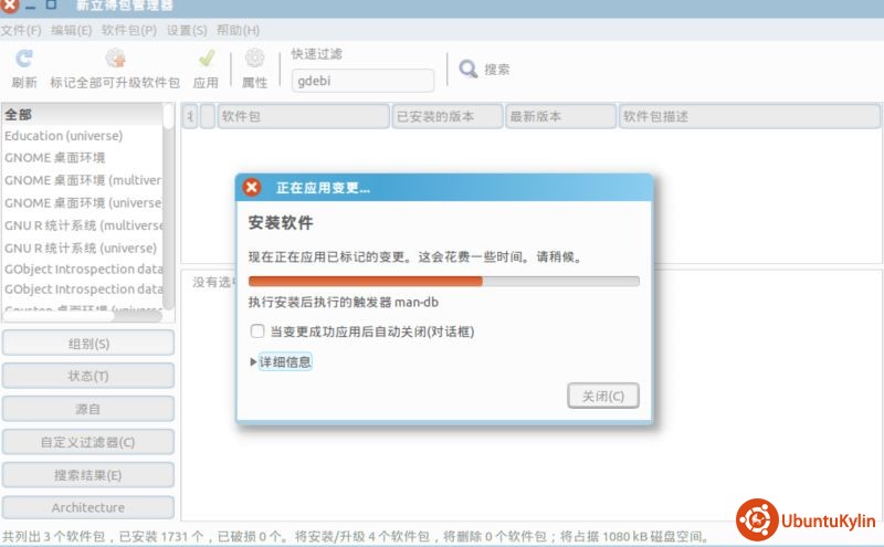 安装完毕会给出提示,关闭提示窗口,返回到主界面,GDebi 成功安装。