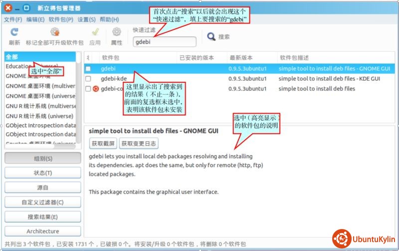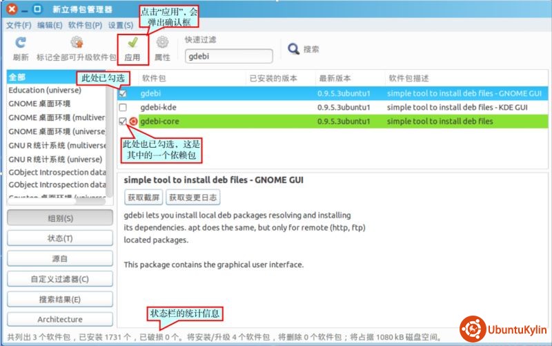 下面我们正好就借安装“gdebi 软件包安装工具”来“牛刀小试”一下“新立得软件包管理器”。