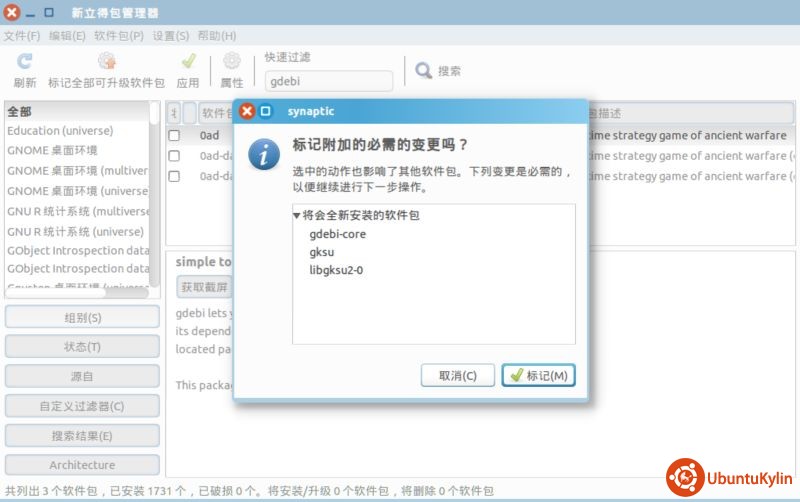 弹出这个对话框即意味着要安装“gdebi”,必须同时安装图中列表里列出的 3 个软件包,这就是所谓的“软件包依赖”,根本不用我们操心,“新立得”帮我们搞定了,我们当然要点“标记”按钮,返回到主界面,见下图(图7):