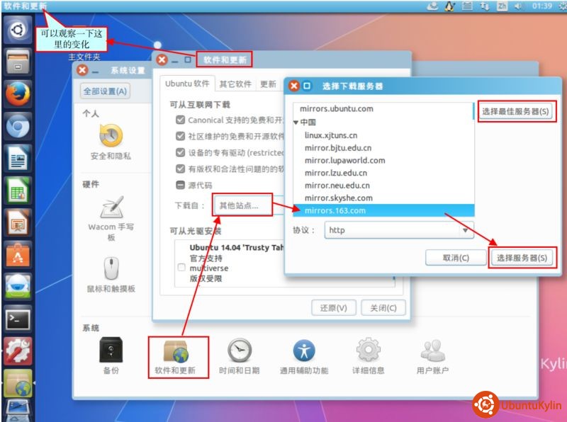 点击启动器上的“系统设置”,弹出“系统设置”窗口,点击下方的“软件和更新”,弹出“软件和更新”对话框,再在“ubuntu 软件”标签下的“下载自…”列表里点选“其他站点…”,弹出“选择下载服务器”对话框,见下图(图1):