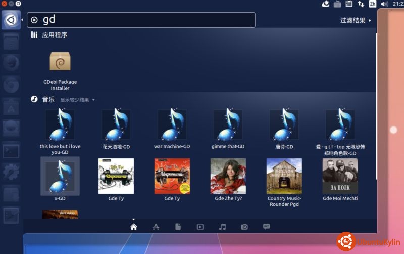 不过这一次,安装程序并没有在启动器上添加上“GDebi”的图标(若都加上图标,那启动器肯定拥挤不堪),那么,该到哪里去找 GDebi 的“快捷方式”呢?这时 dash 就派上用场了。点击 dash 图标,在搜索框中输入“gdebi”(实际上我只输入“gd”两个字母,要的东西就已出现了),就出现了如下图所示界面(图10):