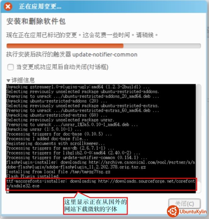 从上图(图5)的对话框中可以看到要安装的软件挺多,例如第一个“cabextract”是解压 cab 压缩包的,第二个“flashplugin-installer”是“flash 插件安装器”,中间许多“gstreamer”打头的基本上都是和多媒体有关的(是不是看到“mp3 ”了?),滚动列表到后面,还会发现“ttf”打头的是和字体有关的,还有“unrar”是解压 rar 压缩包的,等等。“标记”并“应用”吧。安装过程中会出现下图(图6)所示对话框: