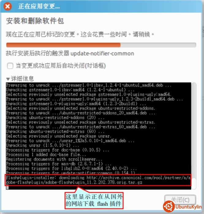 flashplugin-installer 只是个安装器,它还要从 canonical.com 网站(ubuntu 的东家的网站)下载真正的插件包,canonical.com 网站在国外,国内访问速度很不稳定,运气好的话,几十秒就好了,运气不好的话半个小时我也遇到过。同样的,再看下图(图8):