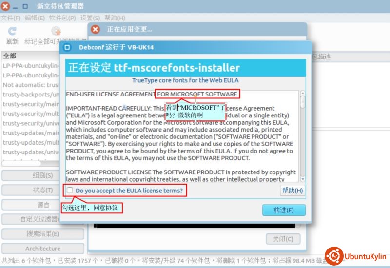 这个对话框是安装“ttf-mscorefonts-installer”(也是个安装器)时出现的“微软”软件最终用户协议,同意吧,“前进”,继续安装。如果运气不太好的话,接下来可能会发现程序一直在安装,过了 10 几分钟还在那儿安装,怎么回事?其实,这是因为前面提到的两个“安装器”在作怪:flashplugin-installer 和 ttf-mscorefonts-installer。看下图(图7):