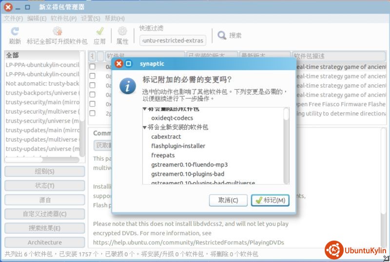 启动新立得,搜索“ubuntu-restricted-extras”,双击它,观察一下下图(图5)的提示: