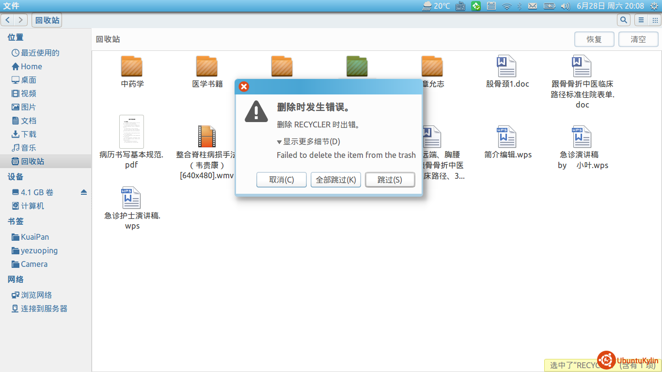 用这条命令一定会删除:sudo rm -fr $HOME/.local/share/Trash/files/