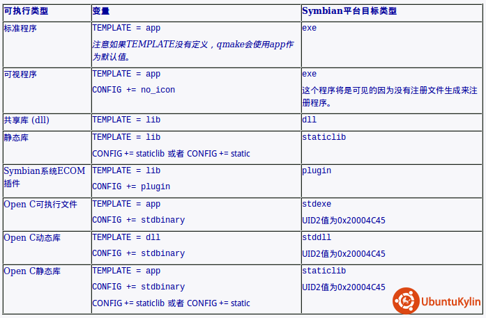 pro文件中的TEMPLATE和CONFIG变量共同定义了目标类型,例如Symbian平台的可执行文件。默认的可执行文件是一个标准程序,也可以指定其他的二进制类型,例如动态库或是Symbian插件。