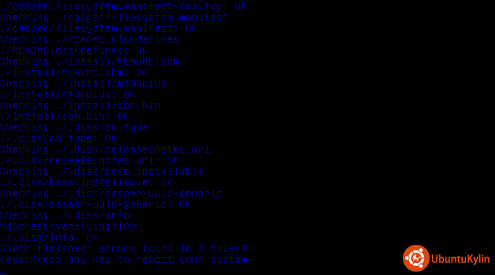 但是对 ubuntukylin 14.04.1 32位的iso文件(md5校验等于 以上 8d9506bc3f127505789d10a90eb9d1c8),在虚拟机中启动,光盘进行“检测盘片是否有错误” 会提示 有2个文件错误,