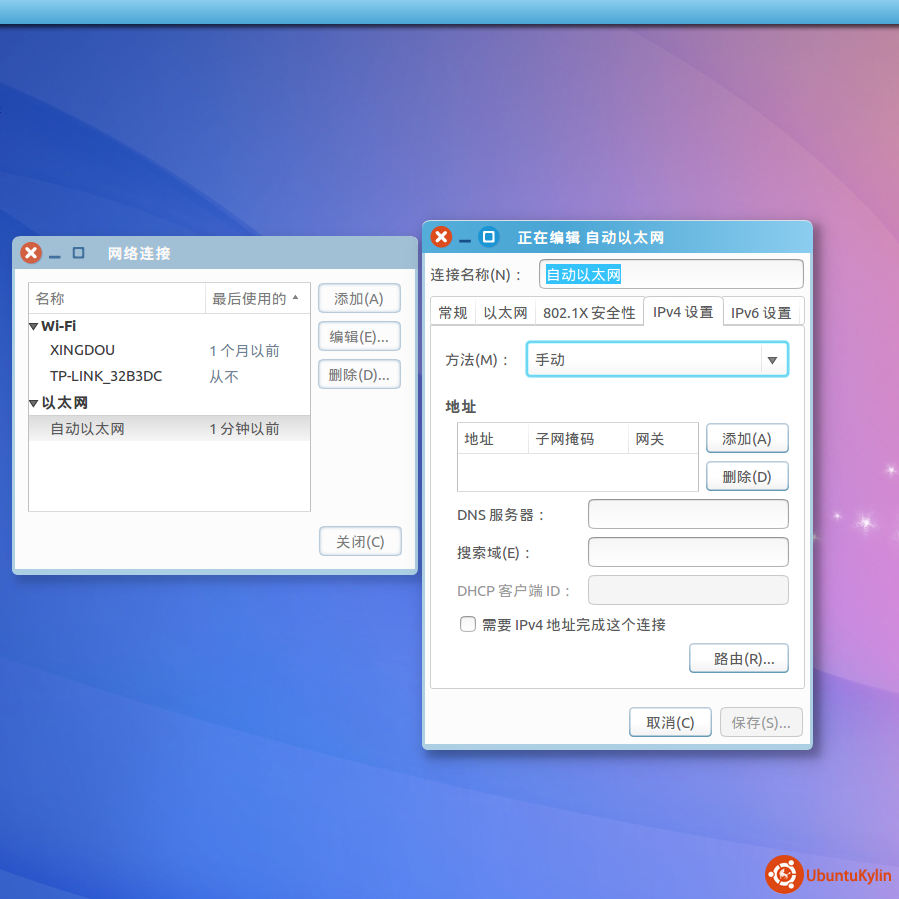 我装的是14.10 ,在外面用无线,自动获取IP地址,可以上网,在单位不管是无线还是有线都需要更改IP地址,但是在编辑连接里面那个IPV4手动设置后,保存不了,是灰色的,可请高手指教!