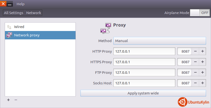 我们通常在浏览器中都配置了代理上网的工具,可以很方便的查询资料,可是有的时候,在终端也需要访问某些网站,那么如何配置全局代理呢?很简单,打开系统设置----网络----网络代理,填入代理地址,点击应用到系统全局即可: